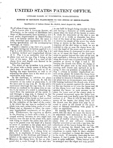 - Titled “Improvements in Bench‑Planes”, Bailey addressed blade chatter that was common when using thin plane irons. He invented an auxiliary bend in the chip breaker (cap iron) so that pressure is applied at three points—heel, toe, and mid-section—stabilizing the blade and allowing the use of thinner, cost-effective blades with less chatter. No-72443 – Improvements in Bench‑Planes